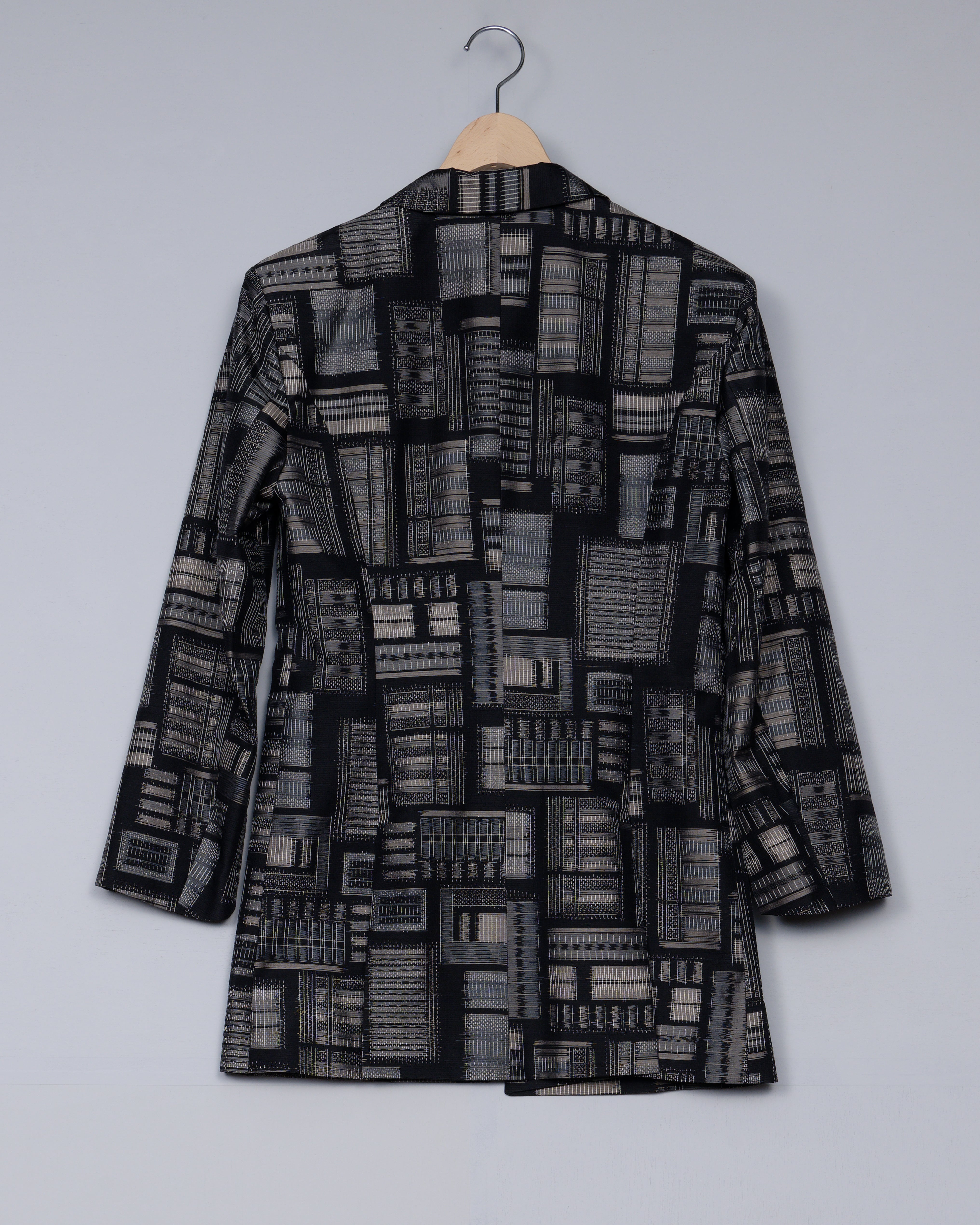 格子戸が並んだような面白い柄の大島紬のスタイリッシュなタキシードジャケット。