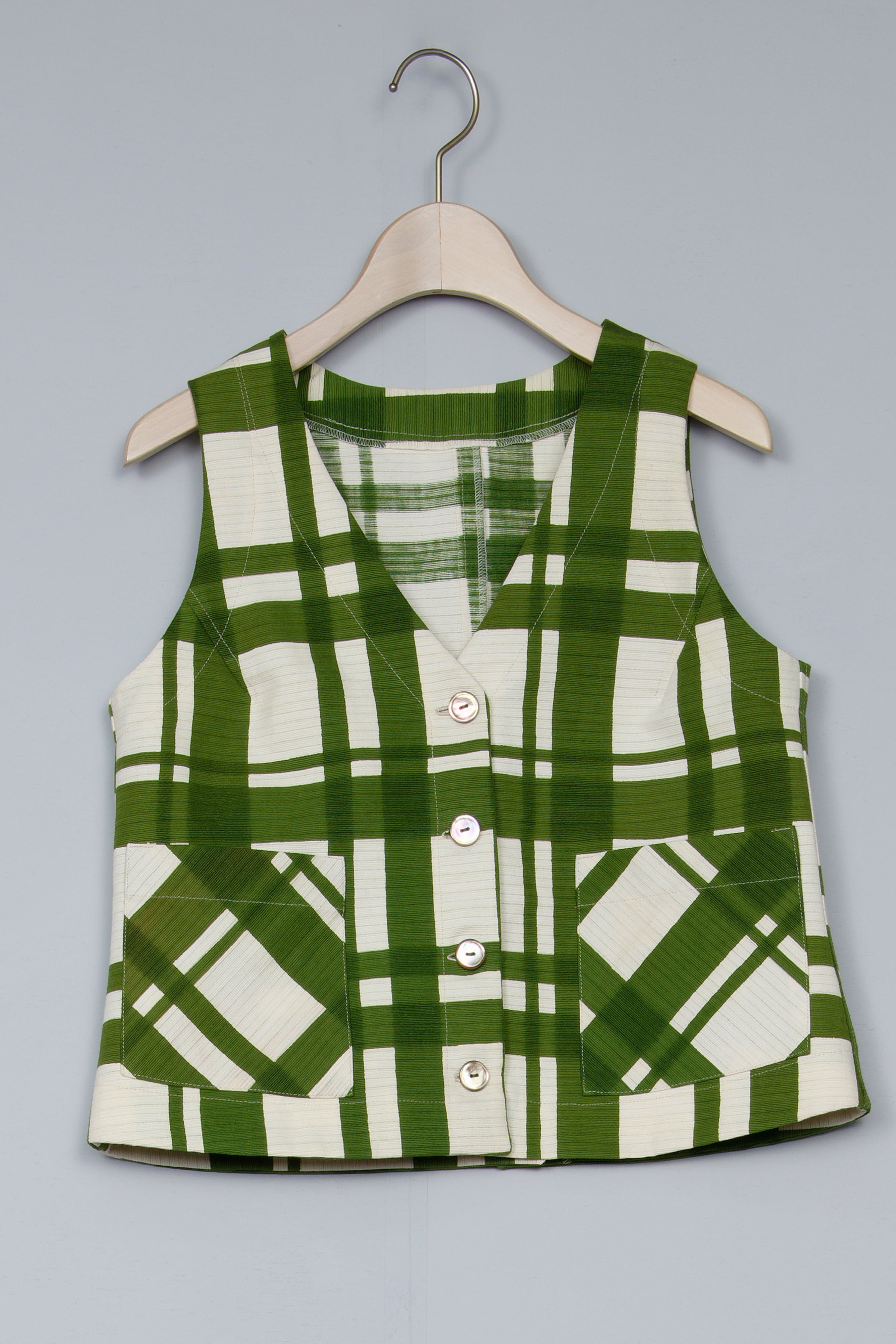 厚手の夏帯をベストトップスにしました。綿ですので、暑い時期に、1枚で素肌に着ていただけます。