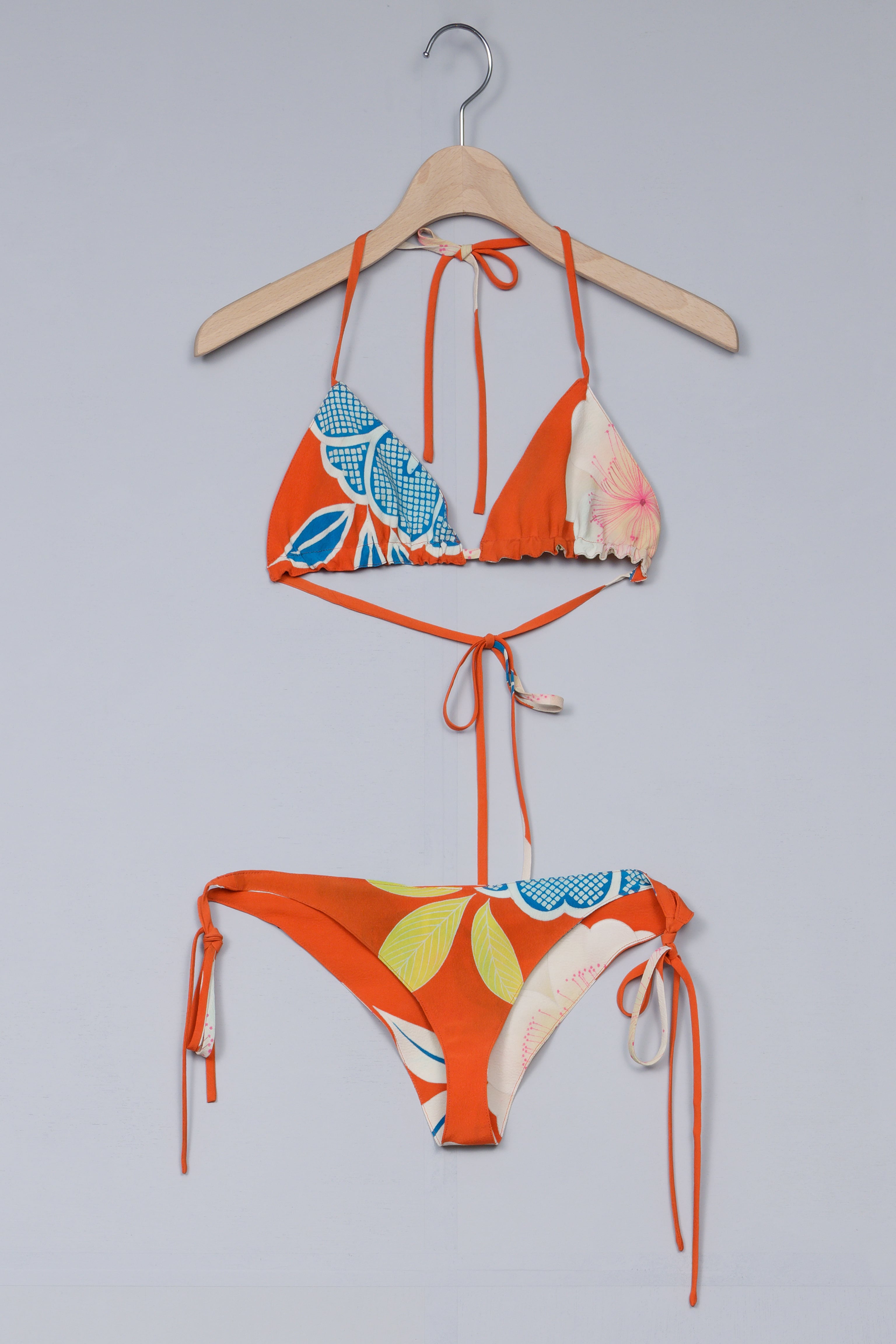 非常に大胆な柄の美しい縮緬のビキニセットとラップスカート。