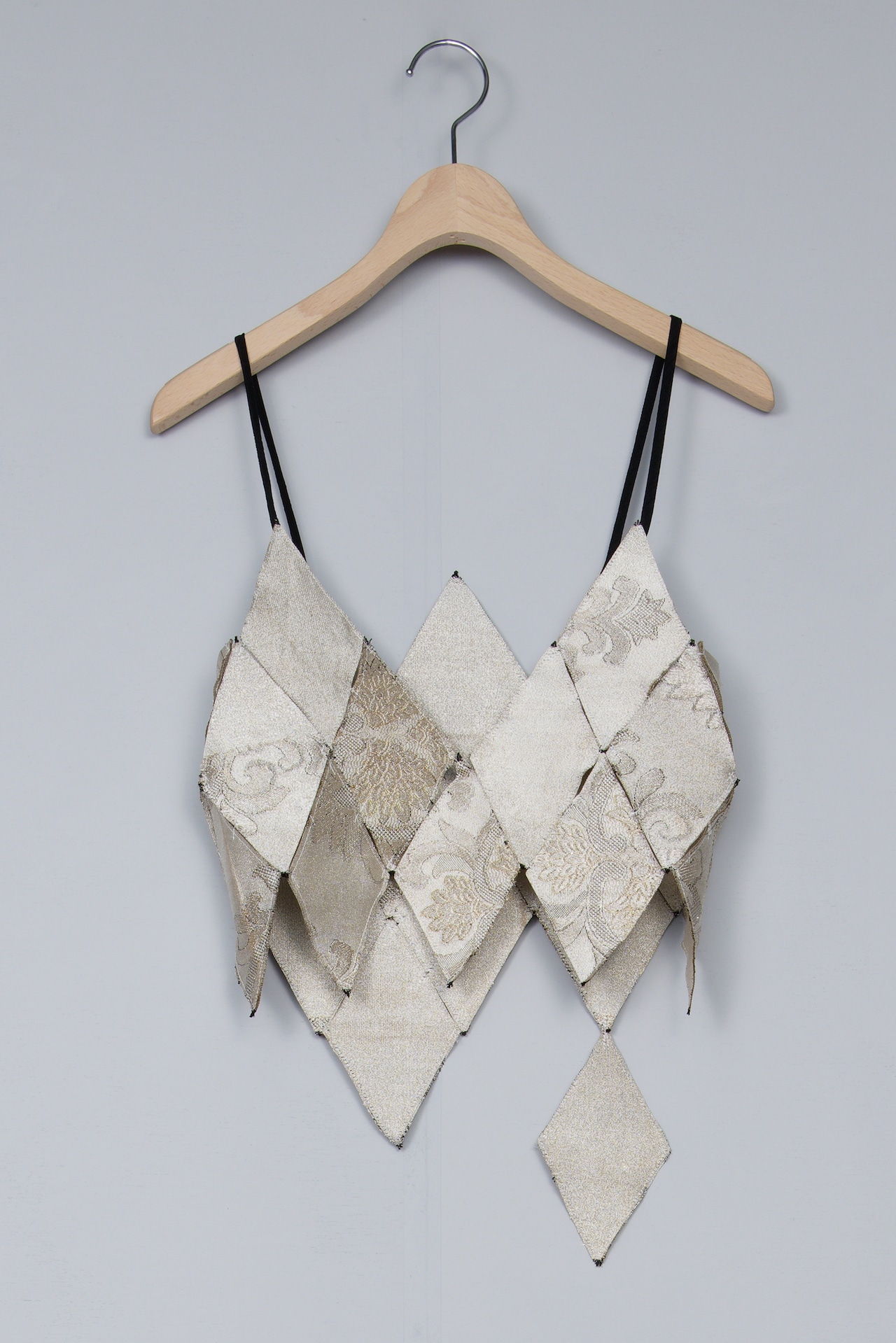銀糸の美しい帯地を菱形にバイアスカット、パーツを繋ぎ合わせたトップス。