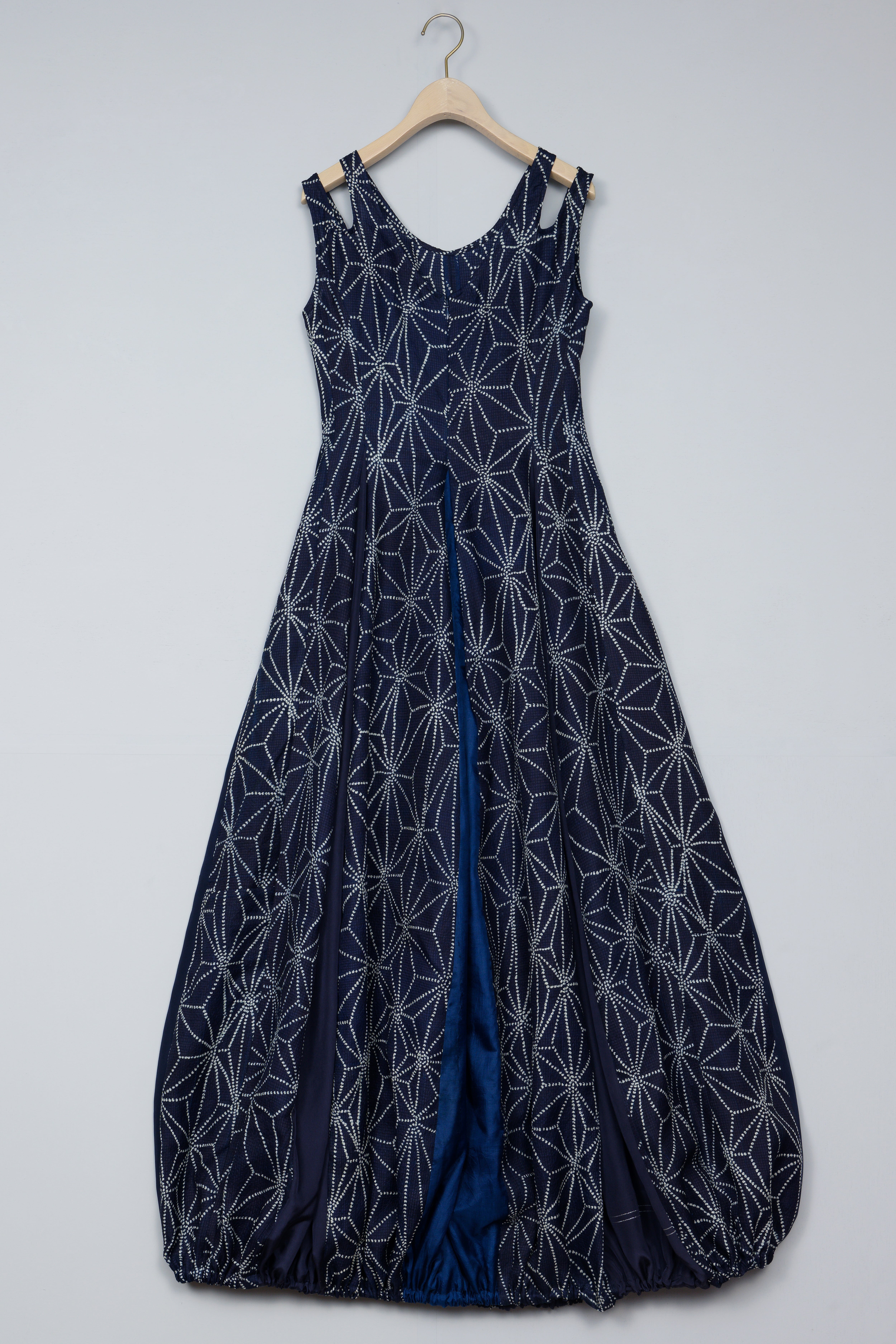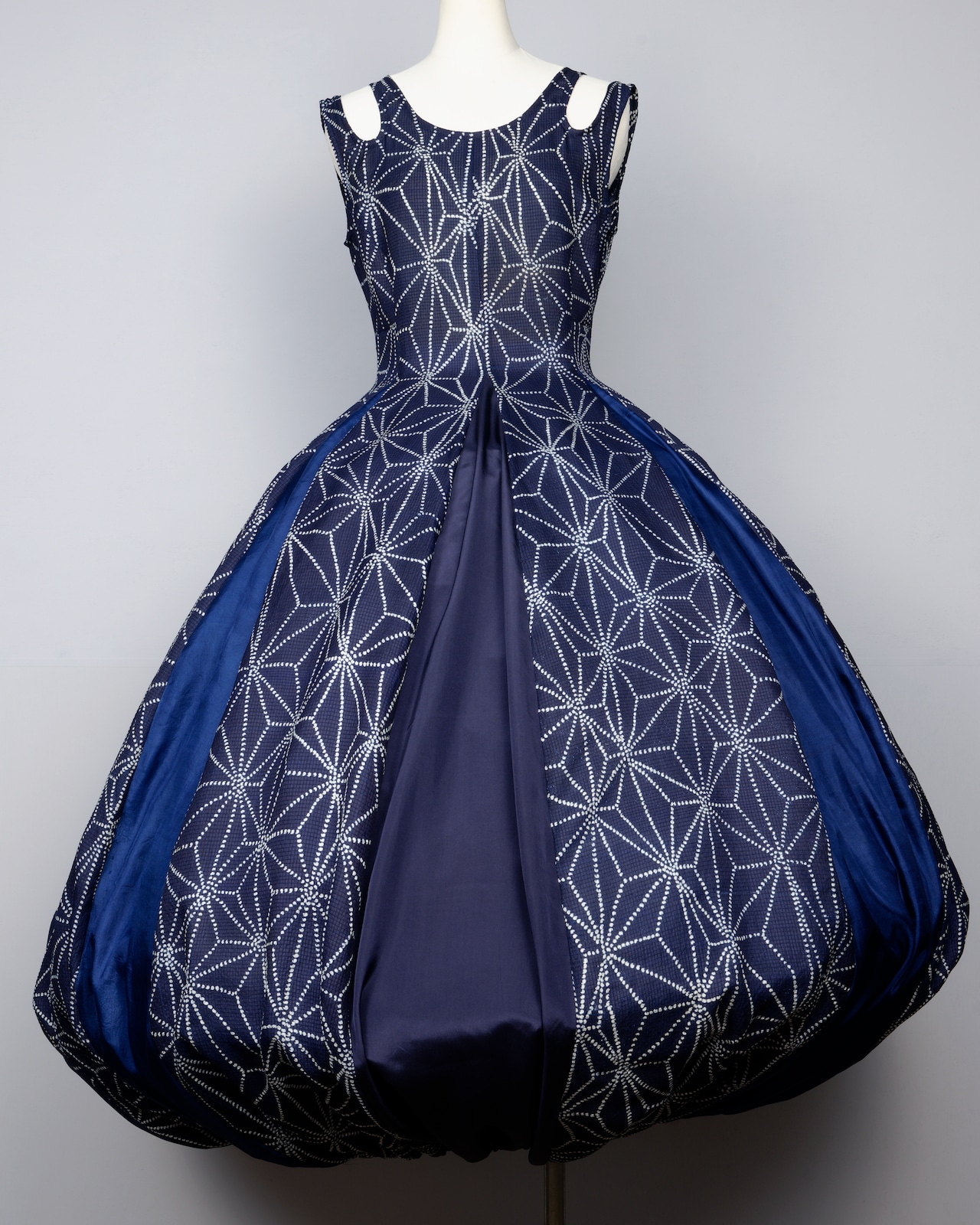 麻の葉柄が美しい生地と、3種類の留紺色の羽二重を組み合わせたロングドレス。