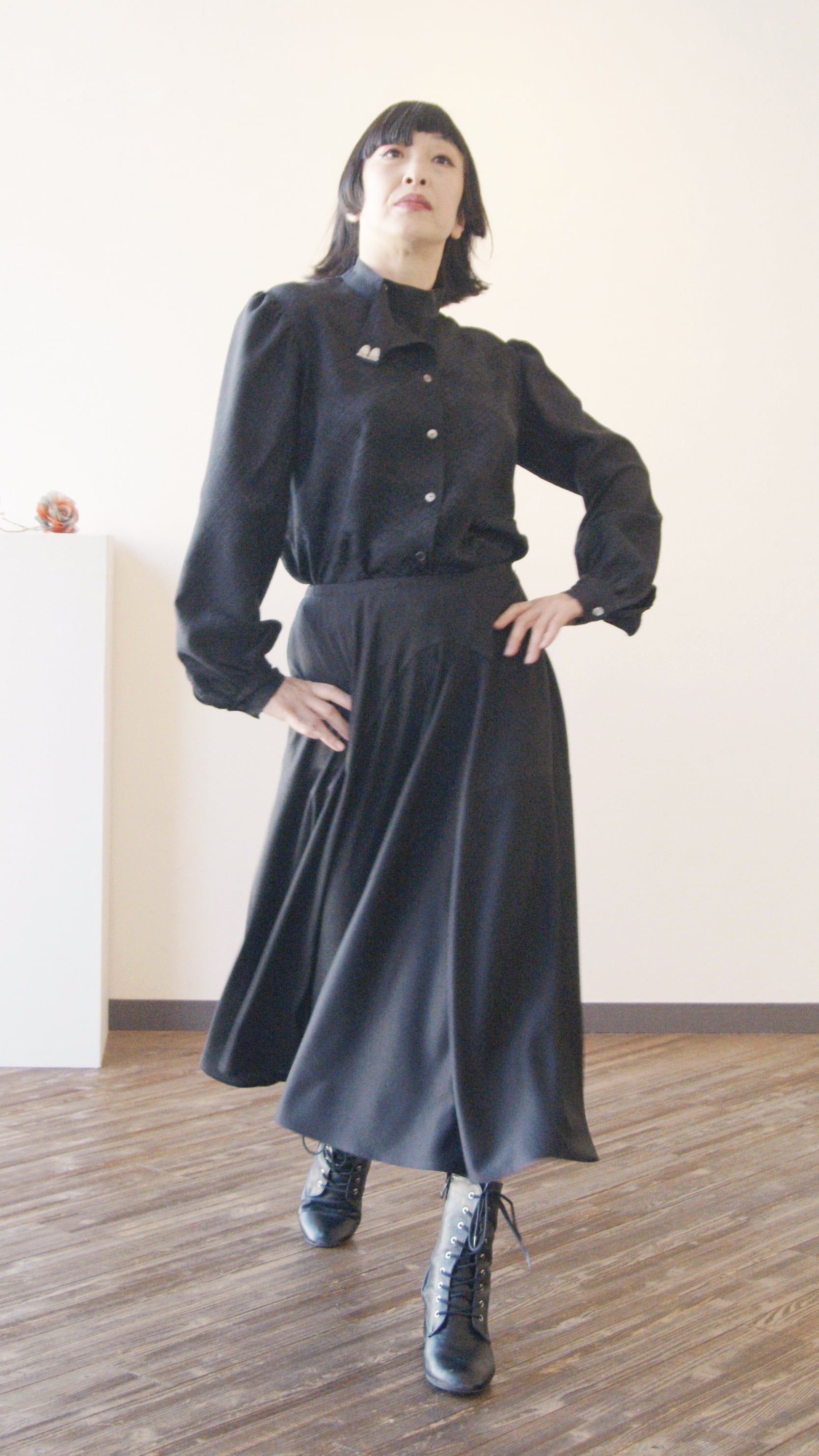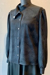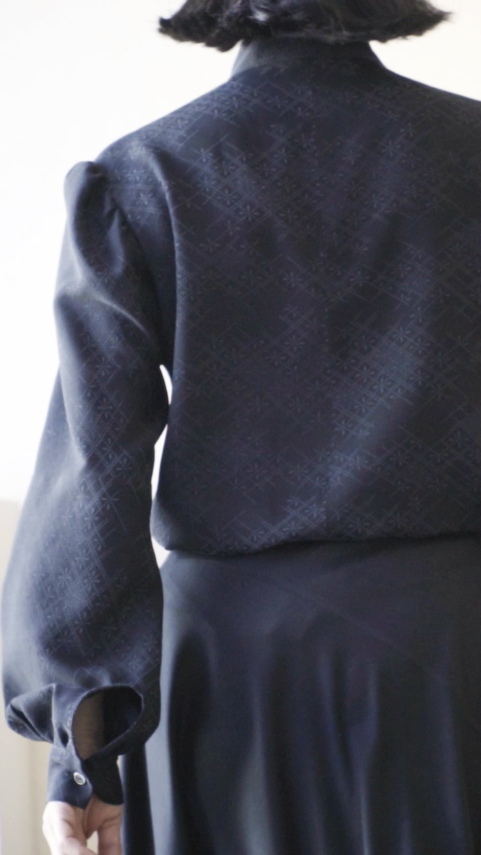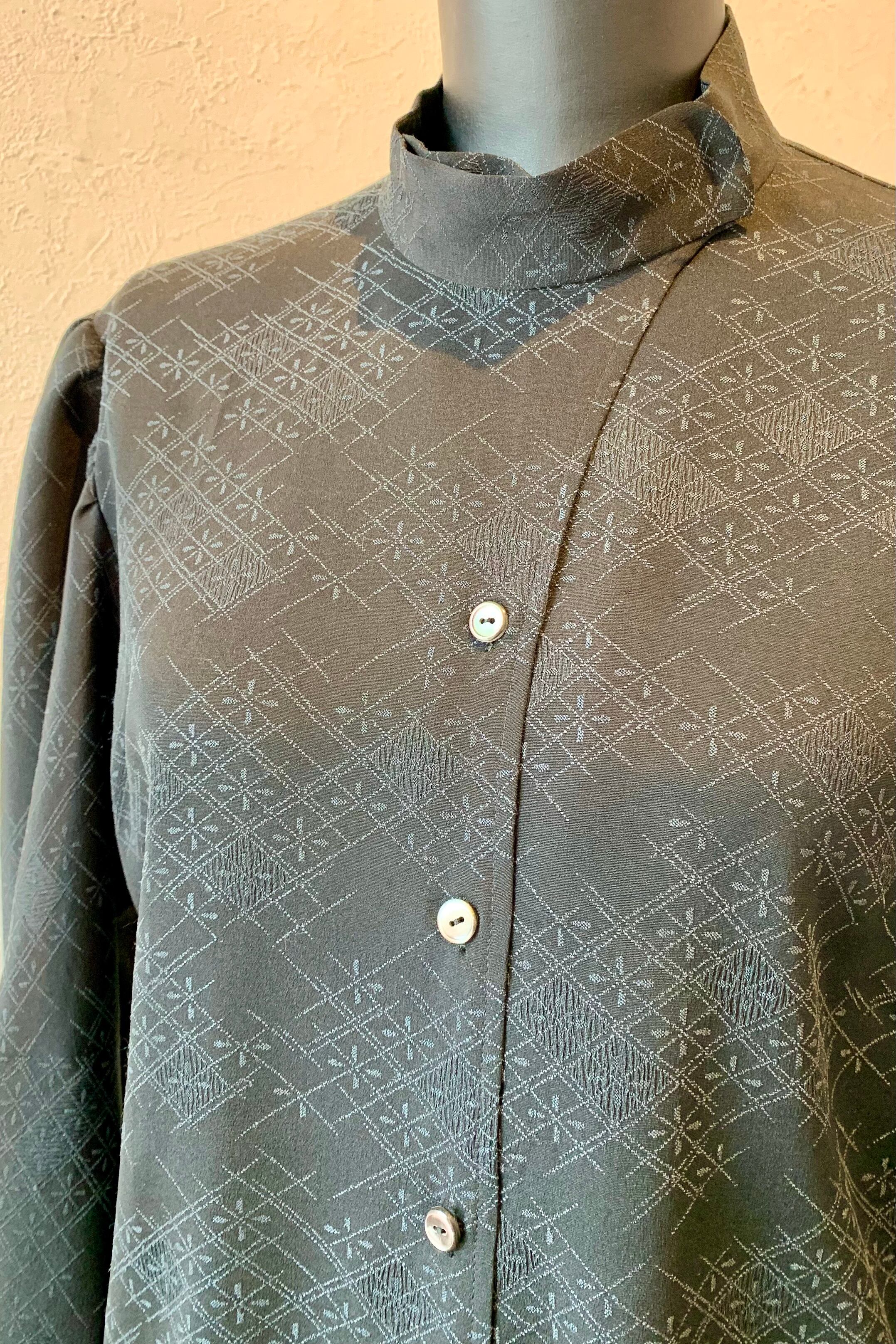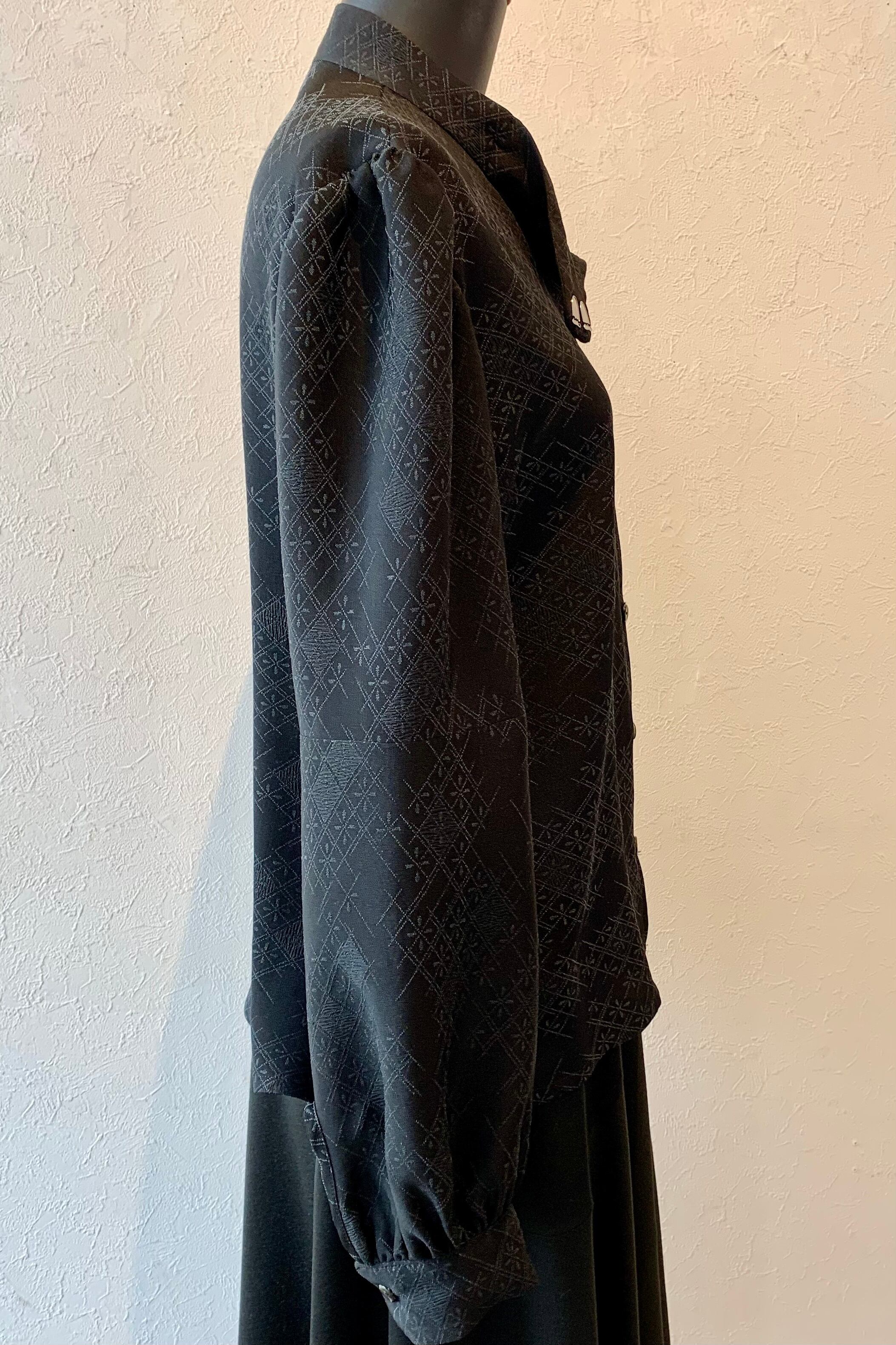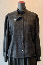 黒地に花入り菱格子柄綸子を使ったバンドカラーシャツブラウス。